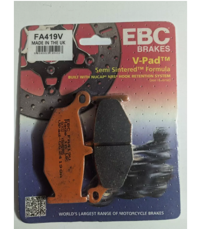 V-Pad™ serisi dyno testine tabi tutulmuş ve diğer ucuz sinterlenmiş fren balatalarından daha uzun ömürlü olduğu kanıtlanmıştır. Tüm EBC Organik fren balataları artık Nucap NRS kanca tutma sistemi ile patentli destek plakalarına sahiptir. Bu, korozyon veya uzun süreli kullanımda fren balatasının bağlanma olasılığının sıfır olmasını garanti eder. EBC, bu fren balatalarının pistte veya yarışta kullanım için olmadığını tavsiye eder.