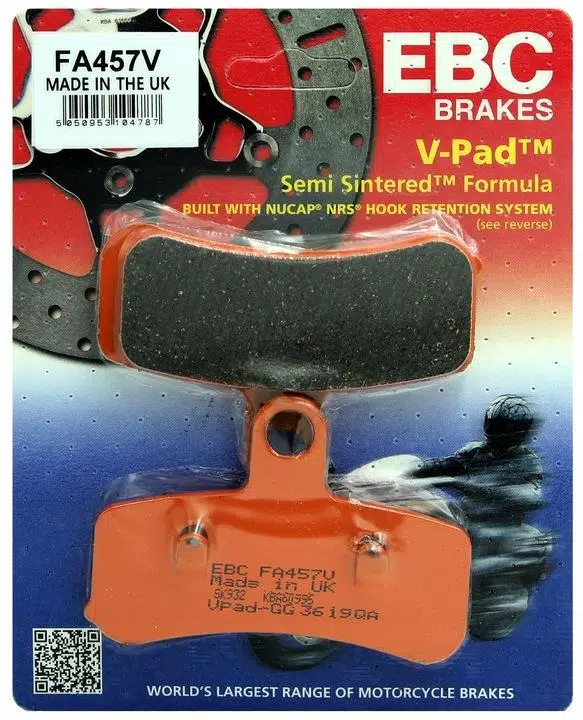 V-Pad™ serisi dyno testine tabi tutulmuş ve diğer ucuz sinterlenmiş fren balatalarından daha uzun ömürlü olduğu kanıtlanmıştır. Tüm EBC Organik fren balataları artık Nucap NRS kanca tutma sistemi ile patentli destek plakalarına sahiptir. Bu, korozyon veya uzun süreli kullanımda fren balatasının bağlanma olasılığının sıfır olmasını garanti eder. EBC, bu fren balatalarının pistte veya yarışta kullanım için olmadığını tavsiye eder.